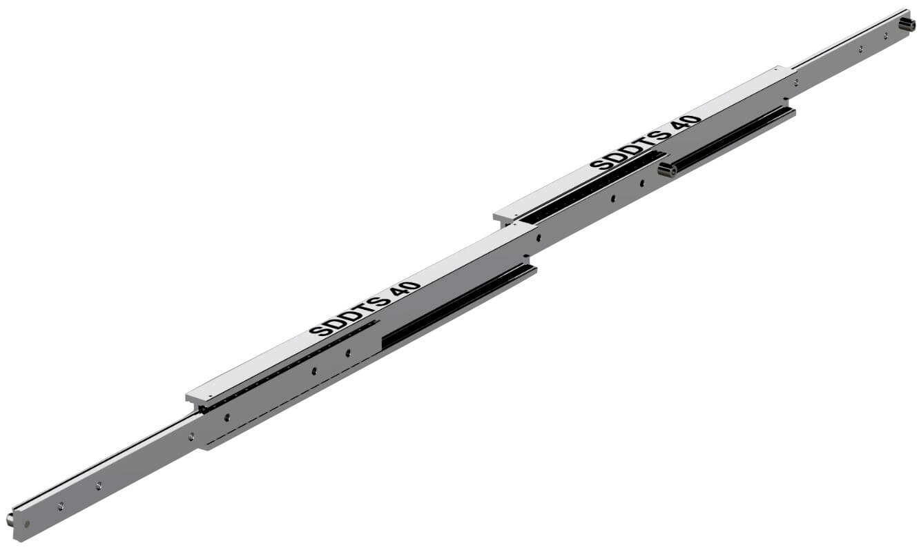 SDDTS-40導軌在閉合長度600mm可以延展1200mm行程(完全展開總長度1800mm), 載重達到84kg。由五節(jié)不銹鋼制成, 并裝配珠槽及鋼珠, 具備相當好的抗震抗沖擊性能, 因此適合安裝于軍用及海上應用。鋼梁、珠槽和鋼珠均采用奧氏體不銹鋼316L (1.4404)制造。螺栓和檔銷則采用奧氏體304 (1.4301)制成,以達到全面性抗腐蝕效果。如有需求,還可以依據(jù)更高的訂購數(shù)量要求定制全316L產(chǎn)品。