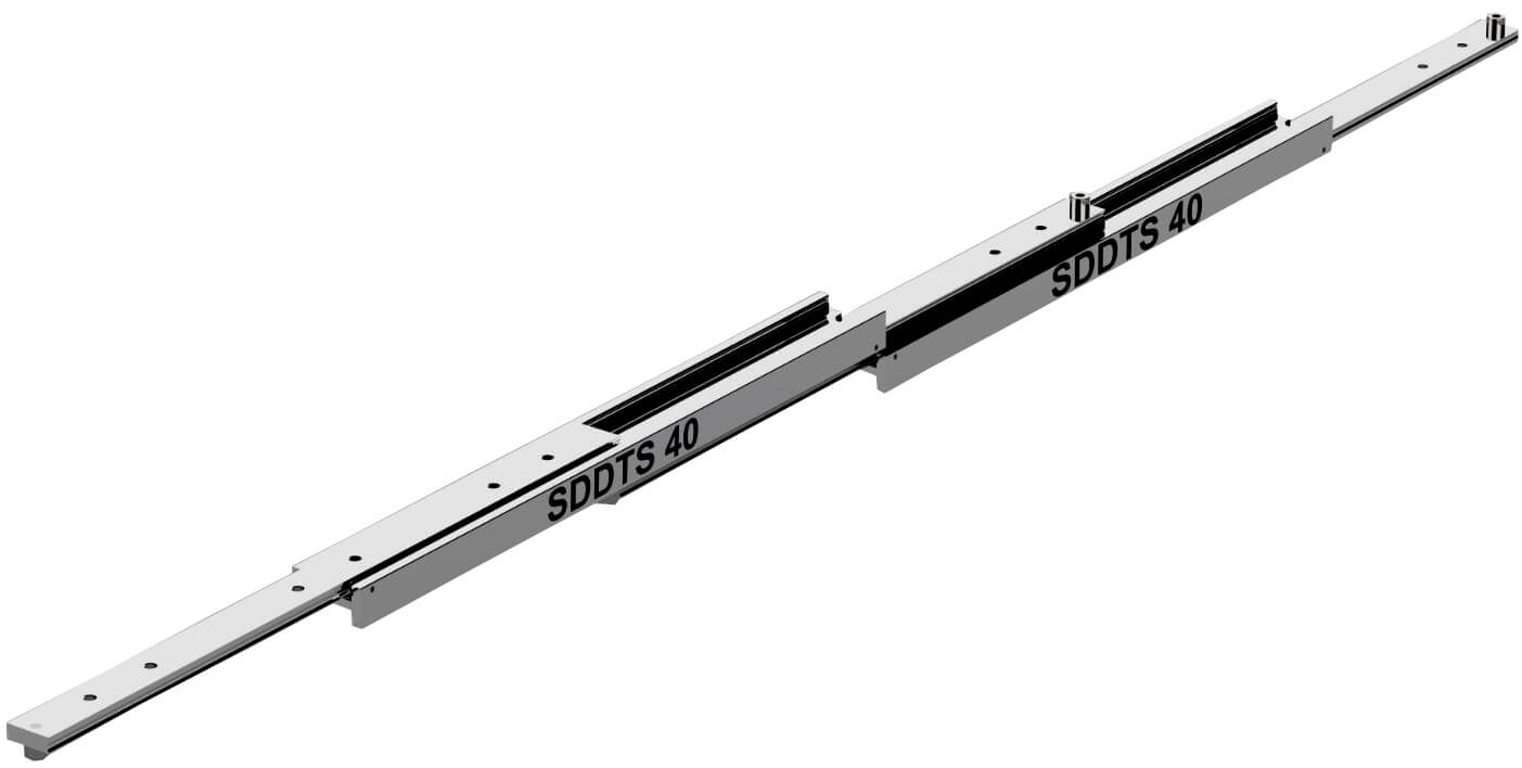 SDDTS-40導軌在閉合長度600mm可以延展1200mm行程(完全展開總長度1800mm), 載重達到84kg。由五節(jié)不銹鋼制成, 并裝配珠槽及鋼珠, 具備相當好的抗震抗沖擊性能, 因此適合安裝于軍用及海上應用。鋼梁、珠槽和鋼珠均采用奧氏體不銹鋼316L (1.4404)制造。螺栓和檔銷則采用奧氏體304 (1.4301)制成,以達到全面性抗腐蝕效果。如有需求