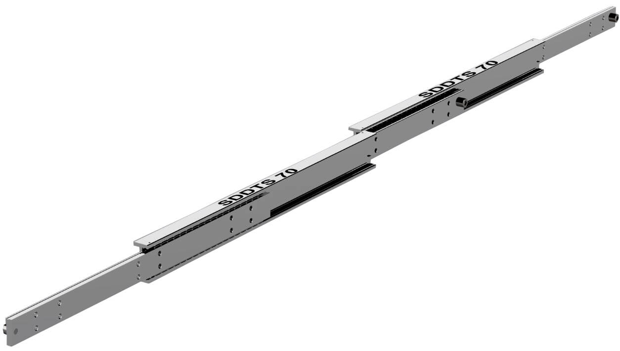 SDDTS-70導軌在閉合長度600mm可以延展1200mm行程(完全展開總長度1800mm), 載重達到231kg。由五節(jié)不銹鋼制成, 并裝配珠槽及鋼珠, 具備相當好的抗震抗沖擊性能, 因此適合安裝于軍用及海上應用。鋼梁、珠槽和鋼珠均采用奧氏體不銹鋼316L (1.4404)制造。螺栓和檔銷則采用奧氏體304 (1.4301)制成,以達到全面性抗腐蝕效果。如有需求,還可以依據(jù)更高的訂購數(shù)量要求定制全316L產(chǎn)品。