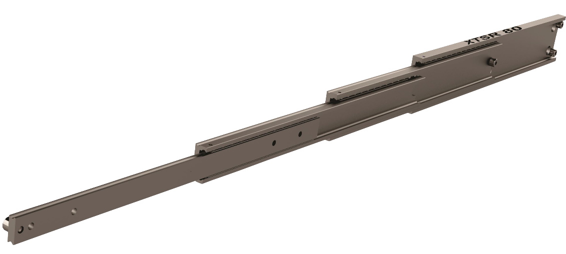 四節(jié)式伸縮導(dǎo)軌可使抽屜從閉合位置向外伸出150%行程, 1000mm的閉合長(zhǎng)度可提供1500mm的延展行程(完全展開總長(zhǎng)度2500mm)。非常適合安裝空間有限的車輛使用。XTSR-80導(dǎo)軌廣泛應(yīng)用于國防產(chǎn)業(yè), 適用于需求超延展導(dǎo)軌的狹窄安裝空間。