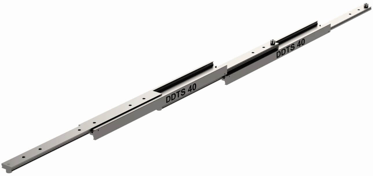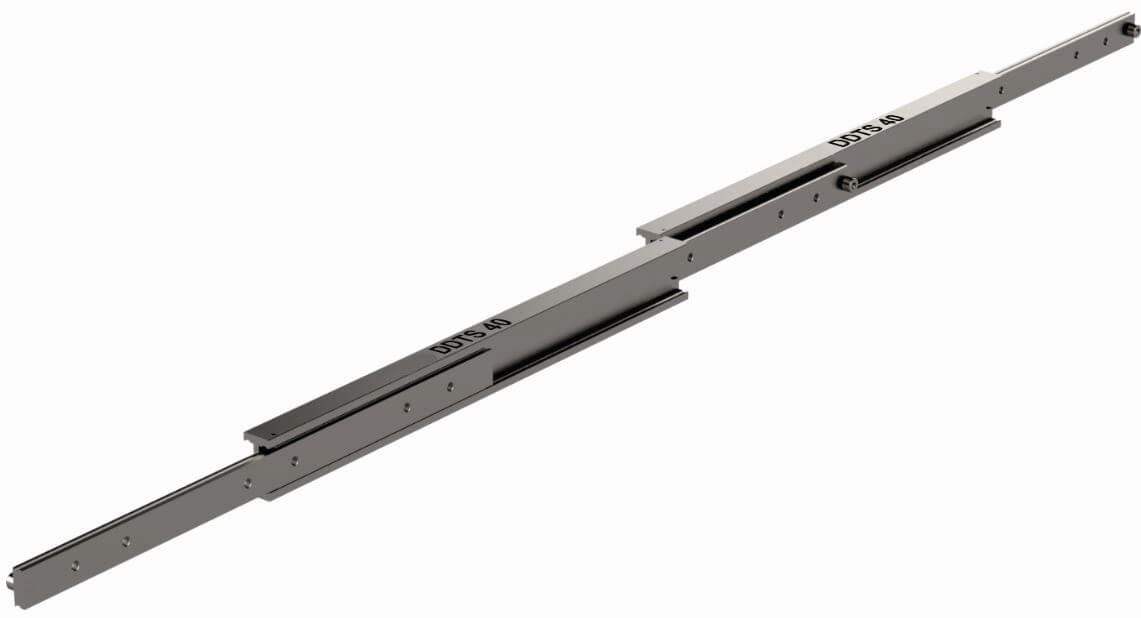 DDTS-40導(dǎo)軌在閉合長度600mm可以延展1200mm行程(完全展開總長度1800mm), 載重達(dá)到140kg。由五節(jié)冷抽鋼制成, 并裝配珠槽及鋼珠, 導(dǎo)軌在閉合靜置的情況下有相當(dāng)好的抗震抗沖擊性能以承受動態(tài)負(fù)載, 因此適合安裝于車載環(huán)境應(yīng)用。這是一款非常堅固的導(dǎo)軌, 采用工字梁結(jié)構(gòu), 提供軸向和同軸扭矩負(fù)載的高抗性, 以達(dá)成延展后最小化撓曲和操作力。