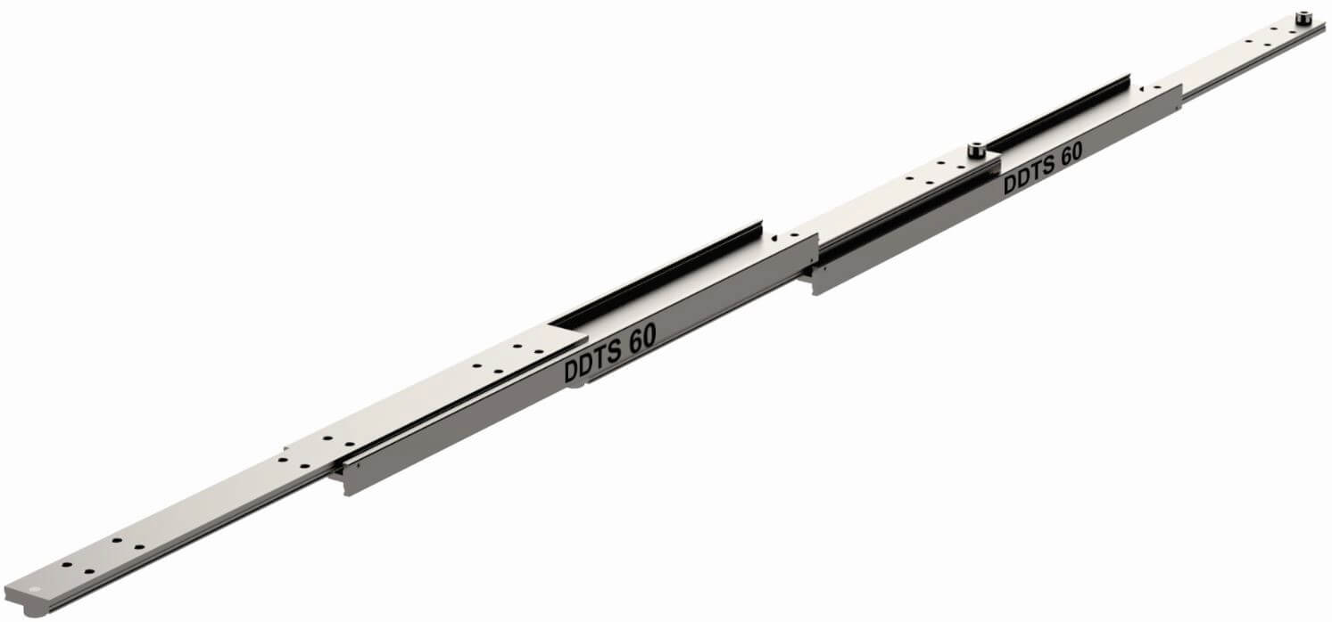 DDTS-60導軌在閉合長度600mm可以延展1200mm行程(完全展開總長度1800mm), 載重達到320kg。由五節(jié)冷抽鋼制成, 并裝配珠槽及鋼珠, 導軌在閉合靜置的情況下有相當好的抗震抗沖擊性能以承受動態(tài)負載, 因此適合安裝于車載環(huán)境應用。這是一款非常堅固的導軌, 采用工字梁結構, 提供軸向和同軸扭矩負載的高抗性, 以達成延展后最小化撓曲和操作力。