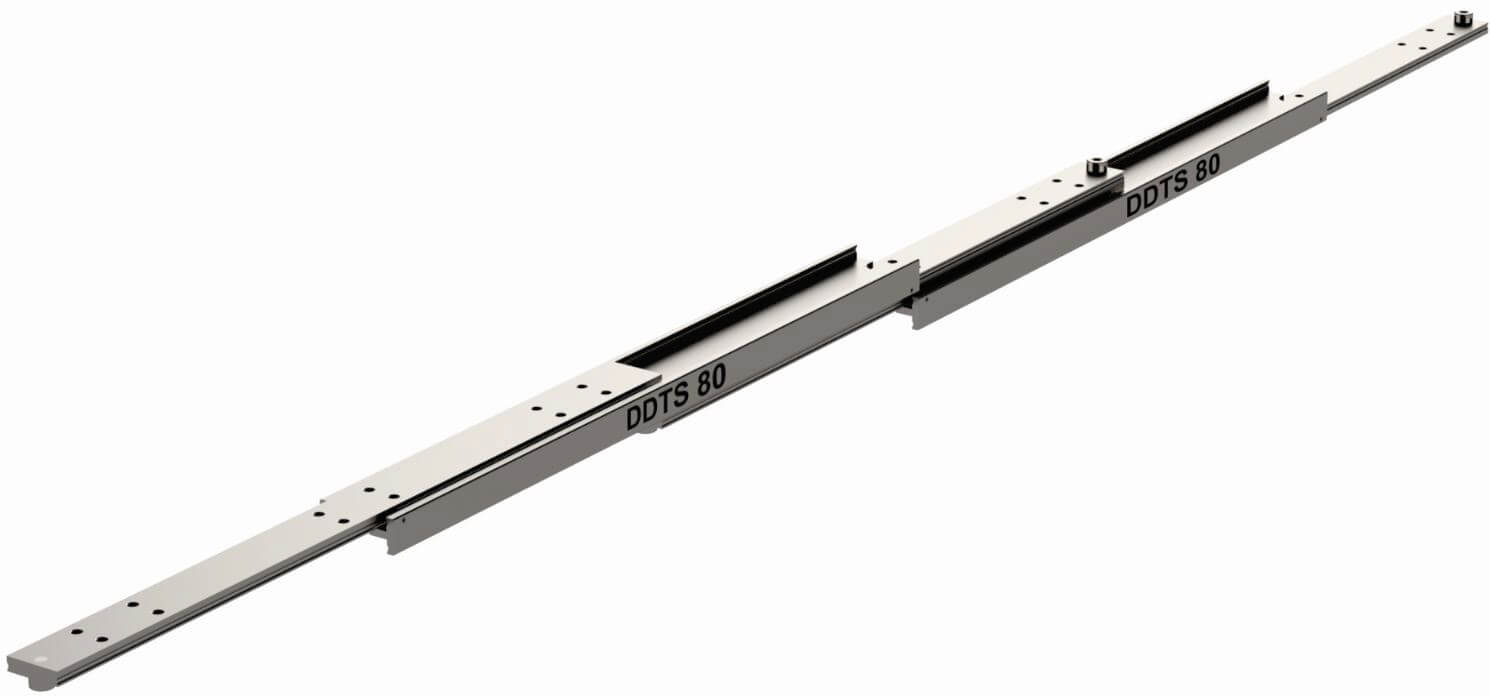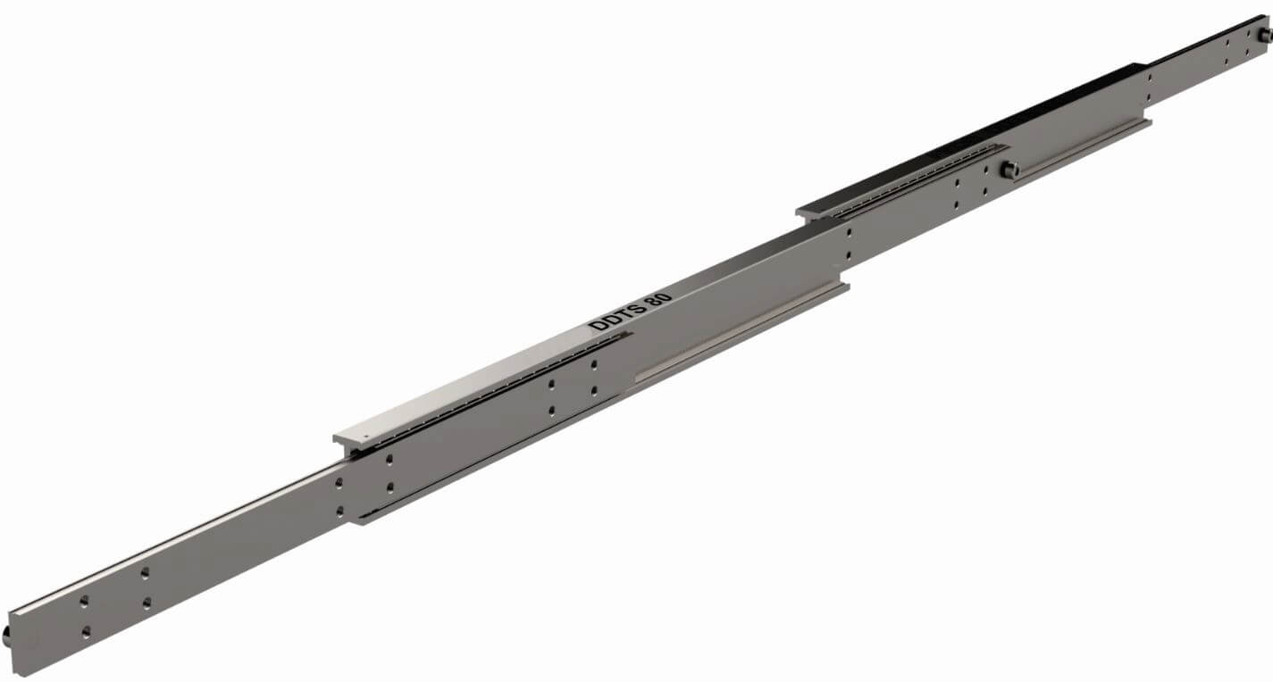 DDTS-80導(dǎo)軌在閉合長(zhǎng)度600mm可以延展1200mm行程(完全展開總長(zhǎng)度1800mm), 載重達(dá)到480kg。由五節(jié)冷抽鋼制成, 并裝配珠槽及鋼珠, 導(dǎo)軌在閉合靜置的情況下有相當(dāng)好的抗震抗沖擊性能以承受動(dòng)態(tài)負(fù)載, 因此適合安裝于車載環(huán)境應(yīng)用。這是一款非常堅(jiān)固的導(dǎo)軌, 采用工字梁結(jié)構(gòu), 提供軸向和同軸扭矩負(fù)載的高抗性, 以達(dá)成延展后最小化撓曲和操作力。