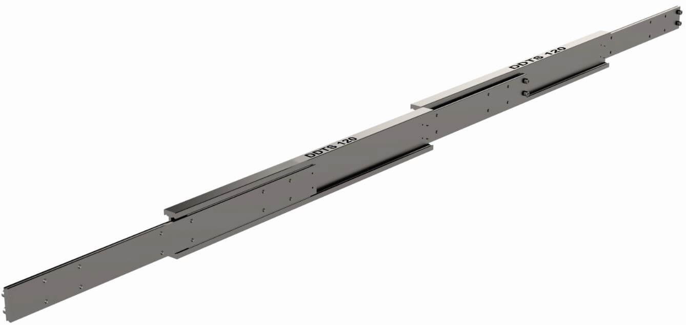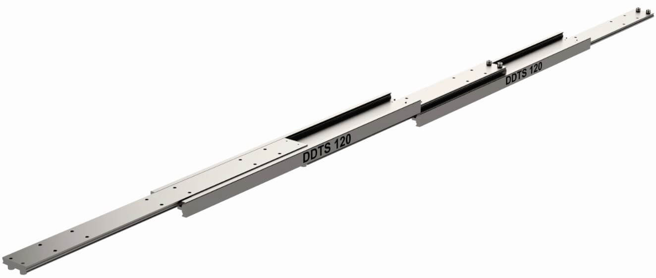 DDTS-120導(dǎo)軌在閉合長(zhǎng)度600mm可以延展1200mm行程(完全展開(kāi)總長(zhǎng)度1800mm), 載重達(dá)到830kg。由五節(jié)冷抽鋼制成, 并裝配珠槽及鋼珠, 導(dǎo)軌在閉合靜置的情況下有相當(dāng)好的抗震抗沖擊性能以承受動(dòng)態(tài)負(fù)載, 因此適合安裝于車(chē)載環(huán)境應(yīng)用。這是一款非常堅(jiān)固的導(dǎo)軌, 采用工字梁結(jié)構(gòu), 提供軸向和同軸扭矩負(fù)載的高抗性, 以達(dá)成延展后最小化撓曲和操作力。