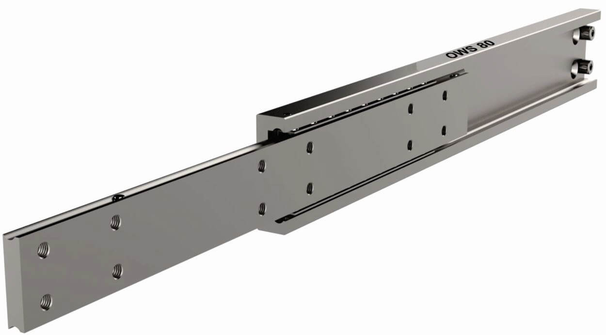 本款導(dǎo)軌行程50%, 載重能力450-1210kg/對, 導(dǎo)軌在550mm長可以延展275mm, 載重達到1110kg。由兩節(jié)冷抽鋼制成, 珠軌經(jīng)過精密加工,OWS-80導(dǎo)軌在閉合靜置的情況下有相當好的抗震抗沖擊性能,因此適合安裝于車載環(huán)境應(yīng)用。導(dǎo)軌在展開時也能夠提供強大的剛性,使其成為支撐動態(tài)負載應(yīng)用和手動抽拉裝置的絕佳選擇。