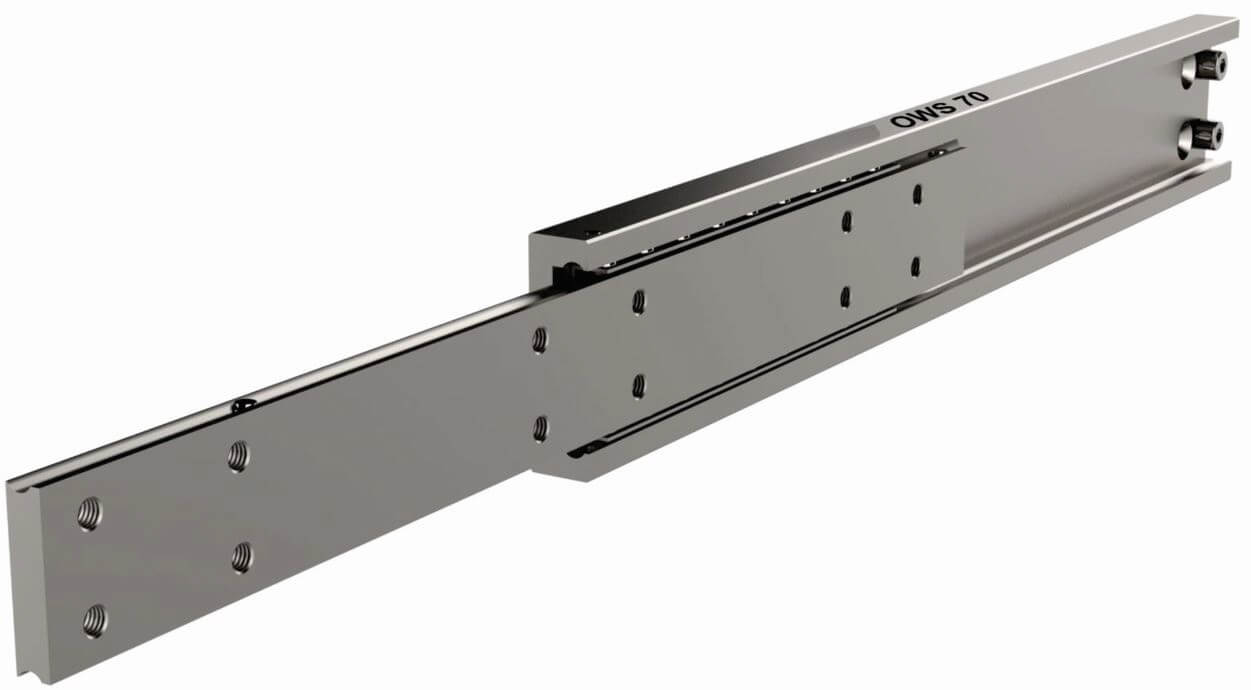 本款導(dǎo)軌行程50%, 載重能力310-1060kg/對(duì), 導(dǎo)軌在550mm長(zhǎng)可以延展275mm, 載重達(dá)到960kg。由兩節(jié)冷抽鋼制成, 珠軌經(jīng)過(guò)精密加工,OWS-70導(dǎo)軌在閉合靜置的情況下有相當(dāng)好的抗震抗沖擊性能,因此適合安裝于車(chē)載環(huán)境應(yīng)用。導(dǎo)軌在展開(kāi)時(shí)也能夠提供強(qiáng)大的剛性,使其成為支撐動(dòng)態(tài)負(fù)載應(yīng)用和手動(dòng)抽拉裝置的絕佳選擇。