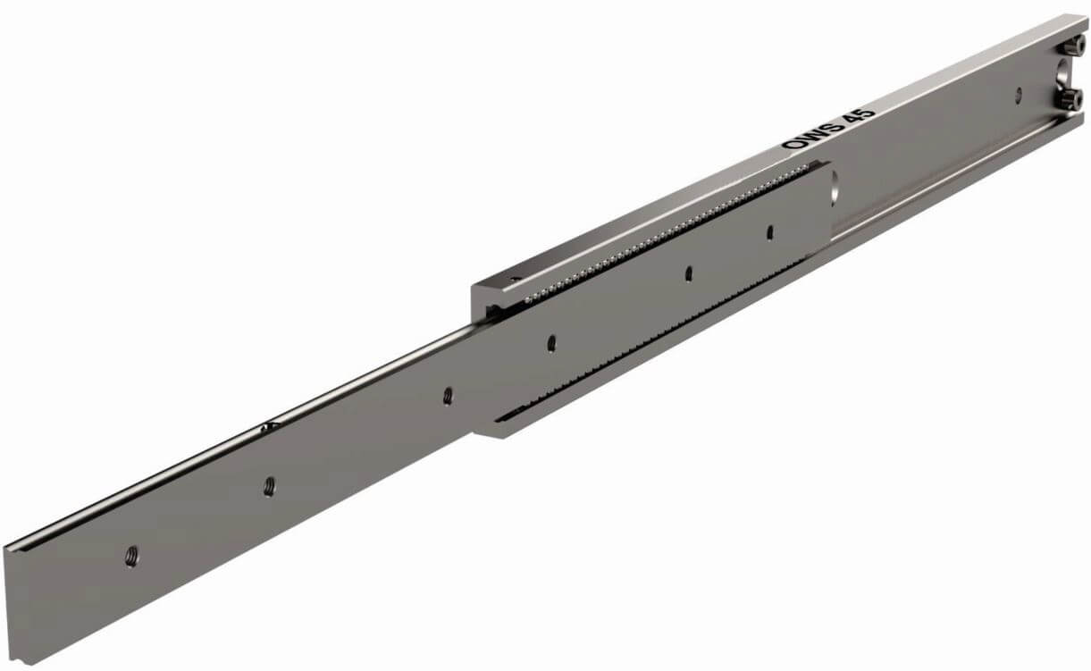 本款導(dǎo)軌行程50%, 載重能力80-270kg/對, 導(dǎo)軌在550mm長可以延展275mm, 載重達(dá)到270kg。由兩節(jié)冷抽鋼制成, 珠軌經(jīng)過精密加工,OWS-45導(dǎo)軌在閉合靜置的情況下有相當(dāng)好的抗震抗沖擊性能,因此適合安裝于車載環(huán)境應(yīng)用。導(dǎo)軌在展開時也能夠提供強大的剛性,使其成為支撐動態(tài)負(fù)載應(yīng)用和手動抽拉裝置的絕佳選擇。