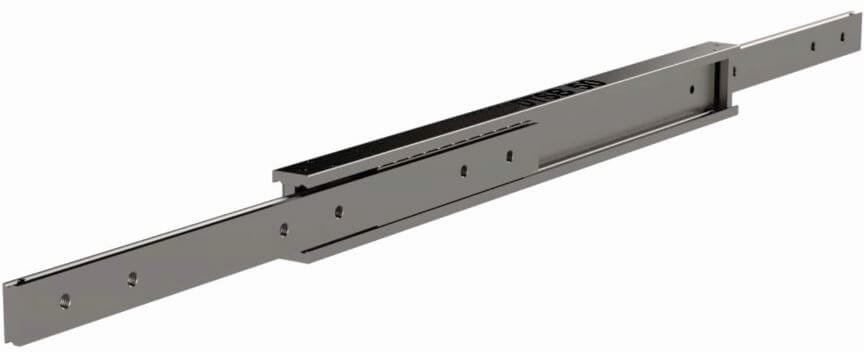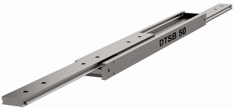 本款導(dǎo)軌雙向行程100%, 載重能力100-420kg/對(duì), 導(dǎo)軌在550mm長(zhǎng)可以向前向后延展550mm, 載重達(dá)到410kg。由三節(jié)冷抽鋼制成, 并裝配珠槽及鋼珠。DTSB導(dǎo)軌在閉合靜置的情況下有相當(dāng)好的抗震抗沖擊性能以承受動(dòng)態(tài)負(fù)載, 因此適合安裝于車載環(huán)境應(yīng)用。這是一款非常堅(jiān)固的導(dǎo)軌, 采用工字梁結(jié)構(gòu), 提供軸向和同軸扭矩負(fù)載的高抗性, 以達(dá)成延展后最小化撓曲和操作力。