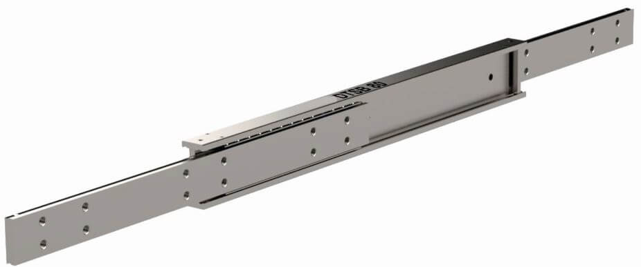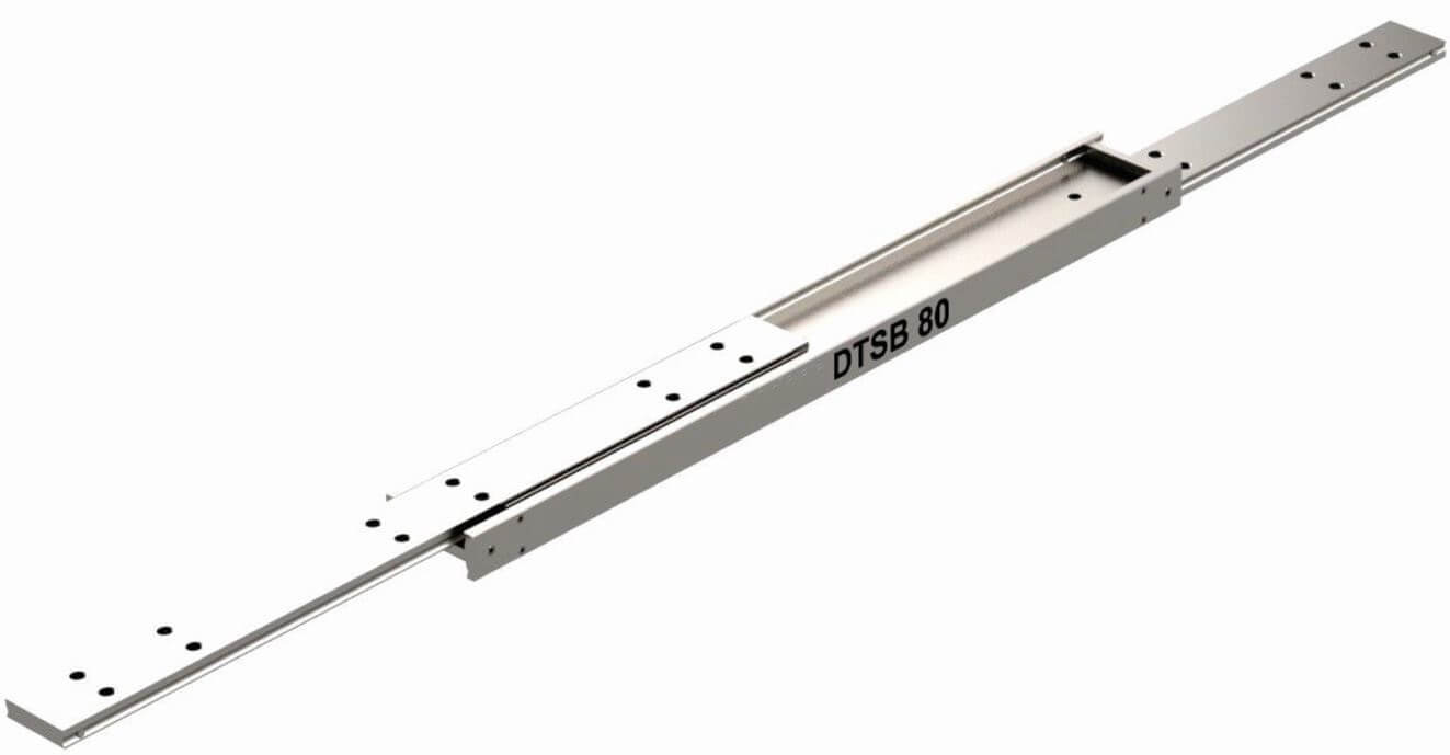 本款導(dǎo)軌雙向行程100%, 載重能力250-880kg/對, 導(dǎo)軌在550mm長可以向前向后延展550mm, 載重達到830kg。由三節(jié)冷抽鋼制成, 并裝配珠槽及鋼珠。DTSB導(dǎo)軌在閉合靜置的情況下有相當(dāng)好的抗震抗沖擊性能以承受動態(tài)負載, 因此適合安裝于車載環(huán)境應(yīng)用。這是一款非常堅固的導(dǎo)軌, 采用工字梁結(jié)構(gòu), 提供軸向和同軸扭矩負載的高抗性, 以達成延展后最小化撓曲和操作力。