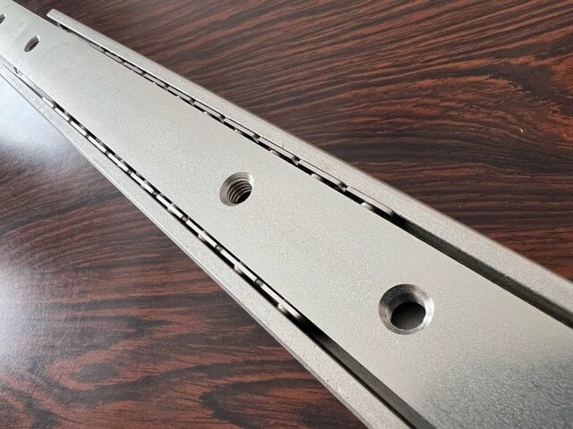 T6級(jí)的航天鋁合金滑軌本身珠軌經(jīng)過特殊精密加工處理。表面為黑色陽極硬化處理, 其他表面處理也可按需求提供。