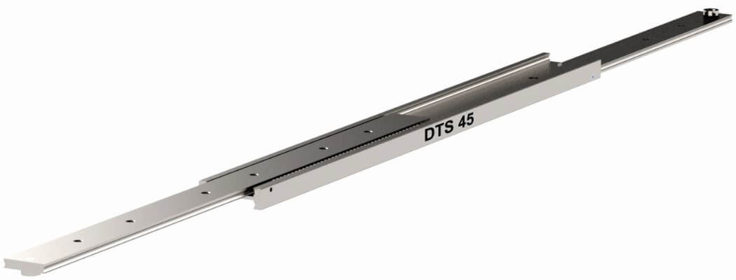 本款導(dǎo)軌行程100%, 載重能力80-166kg/對, 導(dǎo)軌在550mm長可以延展550mm, 載重達到166kg。由三節(jié)冷抽鋼制成, 并采用無珠槽配珠方式, DTS-45導(dǎo)軌在閉合靜置的情況下有相當(dāng)好的抗震抗沖擊性能以承受動態(tài)負(fù)載, 因此適合安裝于車載環(huán)境應(yīng)用。這是一款非常堅固的導(dǎo)軌, 采用工字梁結(jié)構(gòu), 提供軸向和同軸扭矩負(fù)載的高抗性, 以達成延展后最小化撓曲和操作力。
