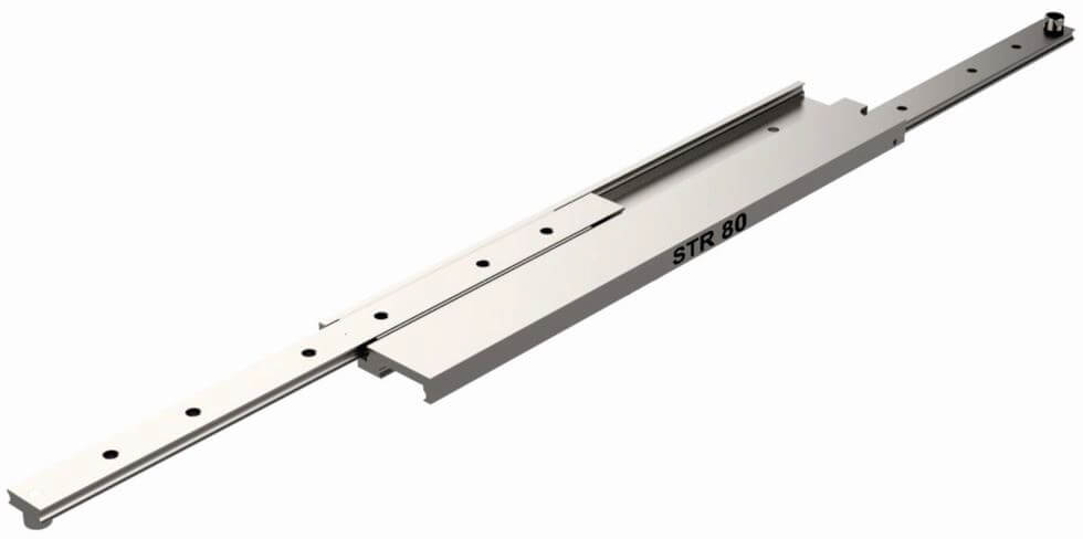 本款導(dǎo)軌行程100%, 載重能力60-300kg/對, 導(dǎo)軌在550mm長可以延展550mm, 載重達(dá)到300kg。由三節(jié)冷抽鋼制成, 并裝配珠槽及鋼珠, STR-80導(dǎo)軌在閉合靜置的情況下有相當(dāng)好的抗震抗沖擊性能以承受動態(tài)負(fù)載, 因此適合安裝于車載環(huán)境應(yīng)用。這是一款非常堅(jiān)固的導(dǎo)軌, 采用S型結(jié)構(gòu), 提供軸向和同軸扭矩負(fù)載的高抗性, 以達(dá)成延展后最小化撓曲和操作力。