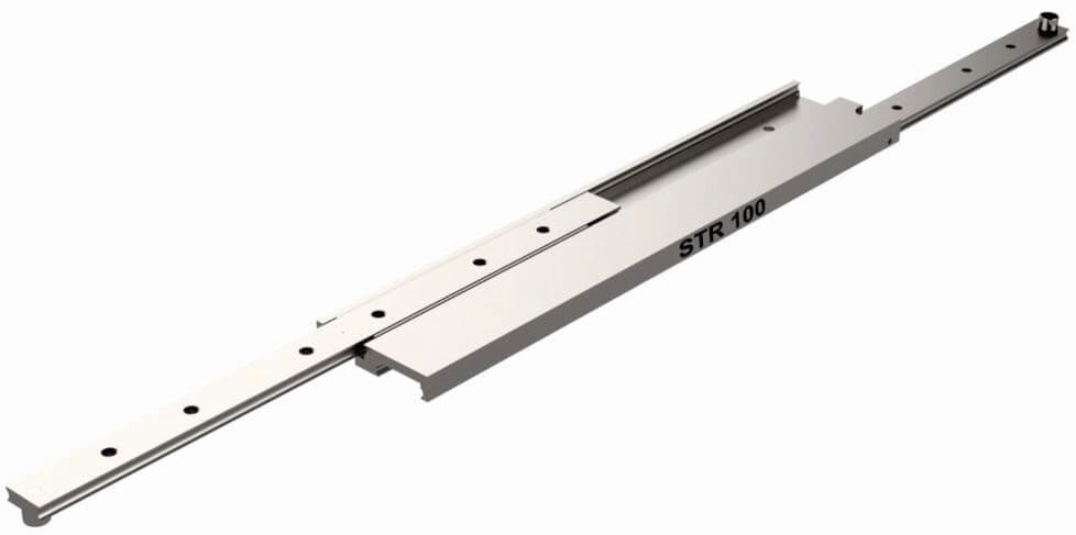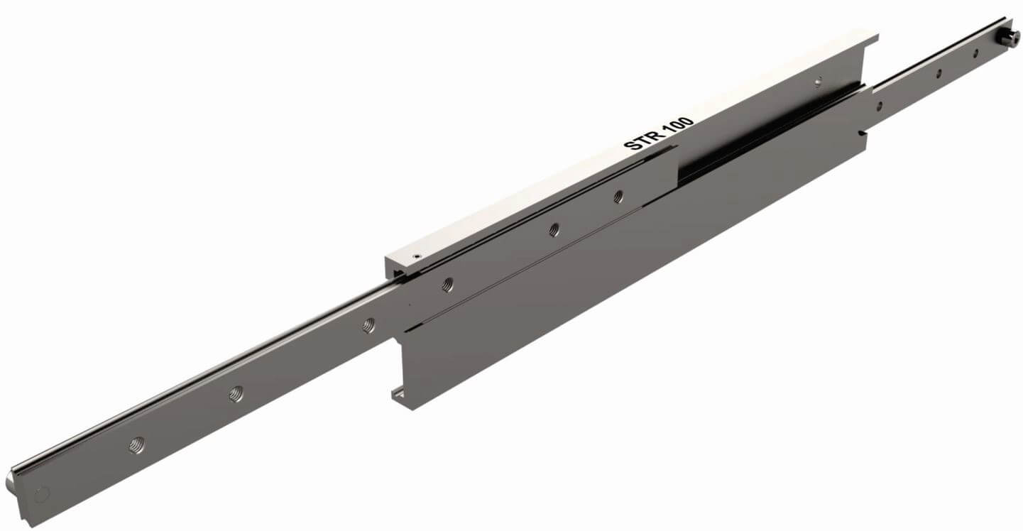 本款導(dǎo)軌行程100%, 載重能力50-435kg/對, 導(dǎo)軌在550mm長可以延展550mm, 載重達(dá)到435kg。由三節(jié)冷抽鋼制成, 并裝配珠槽及鋼珠, STR-100導(dǎo)軌在閉合靜置的情況下有相當(dāng)好的抗震抗沖擊性能以承受動態(tài)負(fù)載, 因此適合安裝于高速鐵路車輛應(yīng)用。這是一款非常堅(jiān)固的導(dǎo)軌, 采用S型結(jié)構(gòu), 提供軸向和同軸扭矩負(fù)載的高抗性, 以達(dá)成延展后最小化撓曲和操作力。
