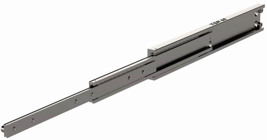 本款導(dǎo)軌行程100%, 載重能力65-435kg/對(duì), 導(dǎo)軌在550mm長(zhǎng)可以延展550mm, 載重達(dá)到420kg。由三節(jié)冷抽鋼制成, 并裝配珠槽及鋼珠, TSR-70導(dǎo)軌在閉合靜置的情況下有相當(dāng)好的抗震抗沖擊性能以承受動(dòng)態(tài)負(fù)載, 因此適合安裝于車載環(huán)境應(yīng)用。這是一款非常堅(jiān)固的導(dǎo)軌, 采用嵌套式的C型結(jié)構(gòu)包覆中內(nèi)兩軌, 雖寬度較薄但仍維持高載重能力。TSR導(dǎo)軌的外軌安裝孔設(shè)計(jì)為皿頭孔, 以利輕松的安裝于柜體內(nèi), 抽屜部分則與內(nèi)軌的螺絲通孔固定。