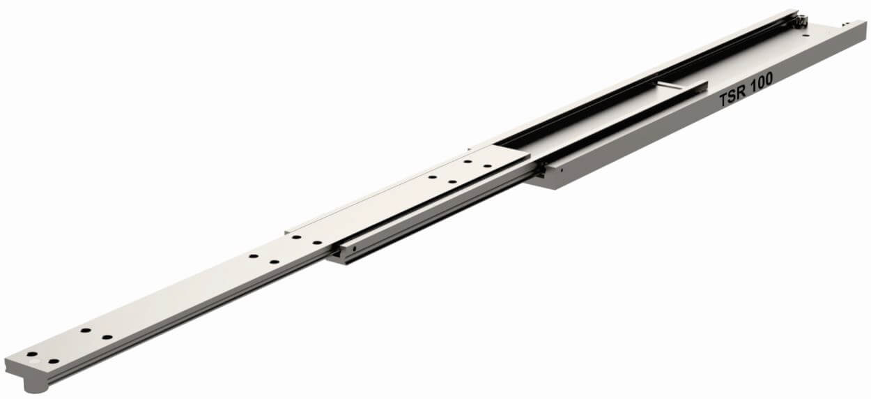 本款導(dǎo)軌行程100%, 載重能力400-1000kg/對(duì), 導(dǎo)軌在550mm長可以延展550mm, 載重達(dá)到980kg。由三節(jié)冷抽鋼制成, 并裝配珠槽及鋼珠, TSR-100導(dǎo)軌在閉合靜置的情況下有相當(dāng)好的抗震抗沖擊性能以承受動(dòng)態(tài)負(fù)載, 因此適合安裝于車載環(huán)境應(yīng)用。這是一款非常堅(jiān)固的導(dǎo)軌, 采用嵌套式的C型結(jié)構(gòu)包覆中內(nèi)兩軌, 雖寬度較薄但仍維持高載重能力。TSR導(dǎo)軌的外軌安裝孔設(shè)計(jì)為皿頭孔, 以利輕松的安裝于柜體內(nèi), 抽屜部分則與內(nèi)軌的螺絲通孔固定。