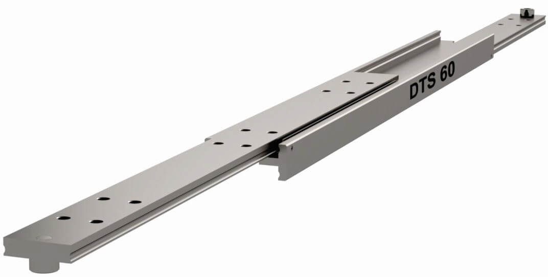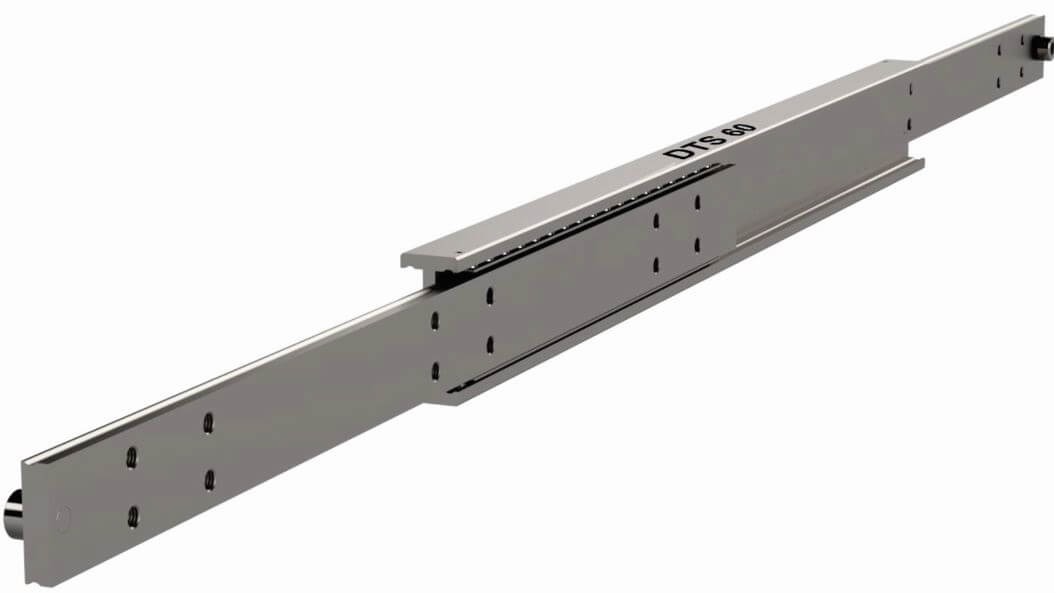本款導(dǎo)軌行程100%, 載重能力180-600kg/對, 導(dǎo)軌在550mm長可以延展550mm, 載重達到550kg。由三節(jié)冷抽鋼制成, 并裝配珠槽及鋼珠, DTS-60導(dǎo)軌在閉合靜置的情況下有相當好的抗震抗沖擊性能以承受動態(tài)負載, 因此適合安裝于車載環(huán)境應(yīng)用。這是一款非常堅固的導(dǎo)軌, 采用工字梁結(jié)構(gòu), 提供軸向和同軸扭矩負載的高抗性, 以達成延展后最小化撓曲和操作力。