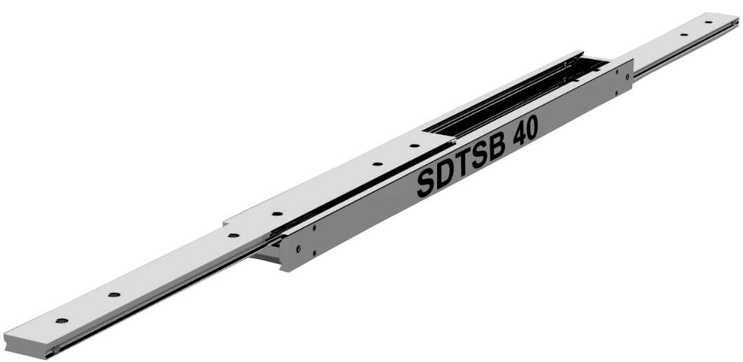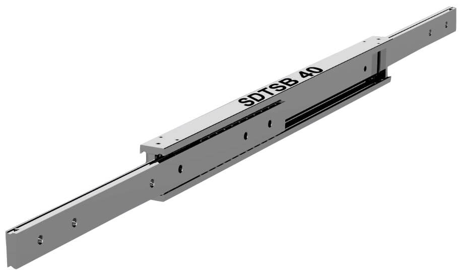 SDTSB-40是一款可向前向后完全延展的堅固伸縮導軌, 設計在導軌本身的特殊擺片機件使得內外軌能夠按順序且流暢的雙向滑移。適合應用于連通車體兩側的抽屜。本款導軌雙向行程100%, 載重能力84-245kg/對, 導軌在550mm長可以向前向后延展550mm, 載重達到245kg。