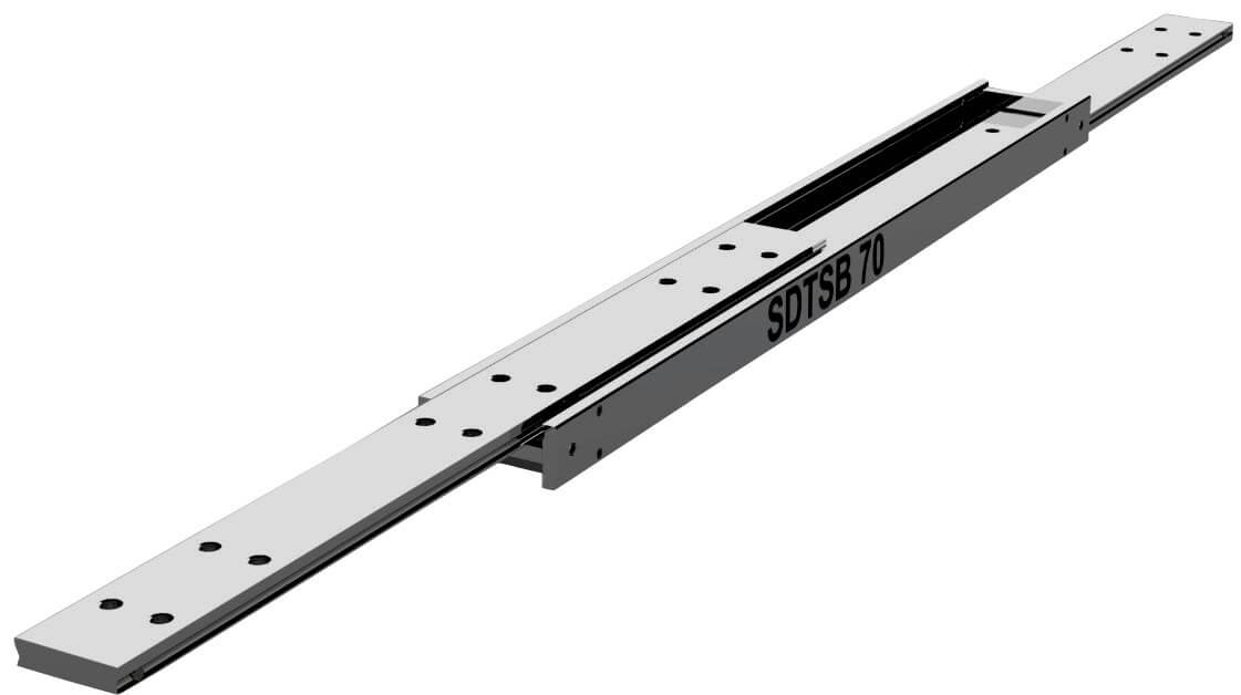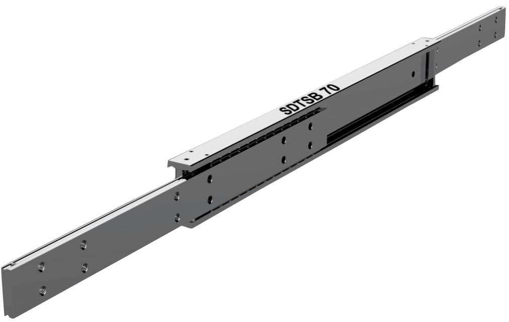 SDTSB-70是一款可向前向后完全延展的堅固伸縮導軌, 設計在導軌本身的特殊擺片機件使得內外軌能夠按順序且流暢的雙向滑移。適合應用于連通車體兩側的抽屜。本款導軌雙向行程100%, 載重能力154-540kg/對, 導軌在550mm長可以向前向后延展550mm, 載重達到490kg。