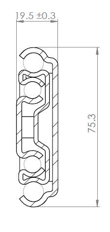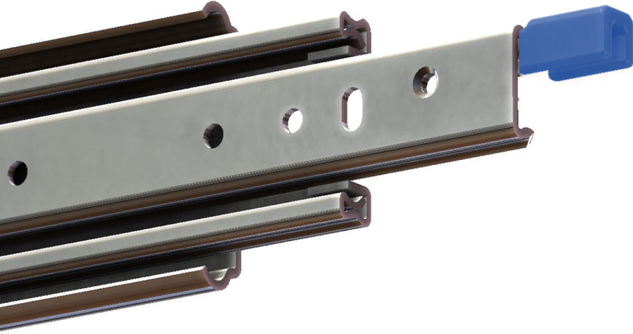 本款滑軌前頭配有醒目的藍(lán)色把手以解鎖閉合及開啟狀態(tài)的抽屜?;壗Y(jié)構(gòu)為冷軋成型, 滑軌內(nèi)部多半中空, 滑軌本身容易附加鎖件, 重量較冷抽鋼輕, 全展時最高能承載227KG重量。顯示尺寸皆為滑軌本體, 若需計(jì)算包含把手的滑軌總長, 需加上28mm把手長。